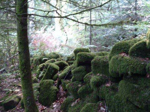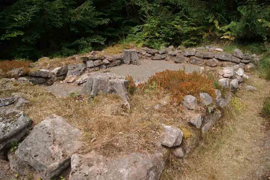 A partir du Hohwalschplatz, on prend un chemin de forêt qui nous mène au-dessus de la Beimbach en suivant les panneaux du Club Vosgien. Au XIX° siècle, des archéologues ont regroupé à l’intérieur d’un mur d’enceinte des stèles-maisons trouvées dans les environs. Il s’agit de pierres tombales en forme de maisons avec une cavité pour recevoir une urne contenant les cendres du défunt. Ce type de tombes est attribué aux celtes.