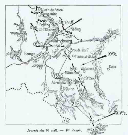 Le 14 Août, les troupes françaises entrèrent à Blâmont puis à Cirey-sur-Vezouze. L’armée française perdit 1 200 hommes : le général Silhol fut relevé de son commandement de la 26ème Division d’Infanterie. Les allemands poursuivant leur retraite, les habitants du pays, au courant des travaux qu’avaient fait le génie allemand, prévenaient les officiers français : « Les Allemands vous attirent sur leurs formidables positions » . En effet, le Prince Ruprecht de Bavière, Commandant la VIème Armée allemande, regroupait ses forces derrière la Sarre, sur des positions bétonnées.