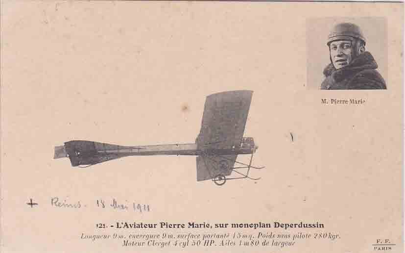 Le lundi 14 Mai 1911, le journal « L’Eclair de l’Est » publiait un article sur Pierre MARIE : « …àBetheny, Pierre MARIE, qui a abandonné le REP pour un monoplan Deperdussin, a fait un vol tout- à -fait impressionnant. Rapidement emporté par son Gnôme à plus de 200 m. il fit à cette altitude des virages en épingles à cheveux qui donnèrent le frisson aux spectateurs et surtout aux pilotes présents…Pierre Marie est un véritable acrobate de l’aviation, mais, un peu plus de prudence, je vous en prie,cher camarade ! »