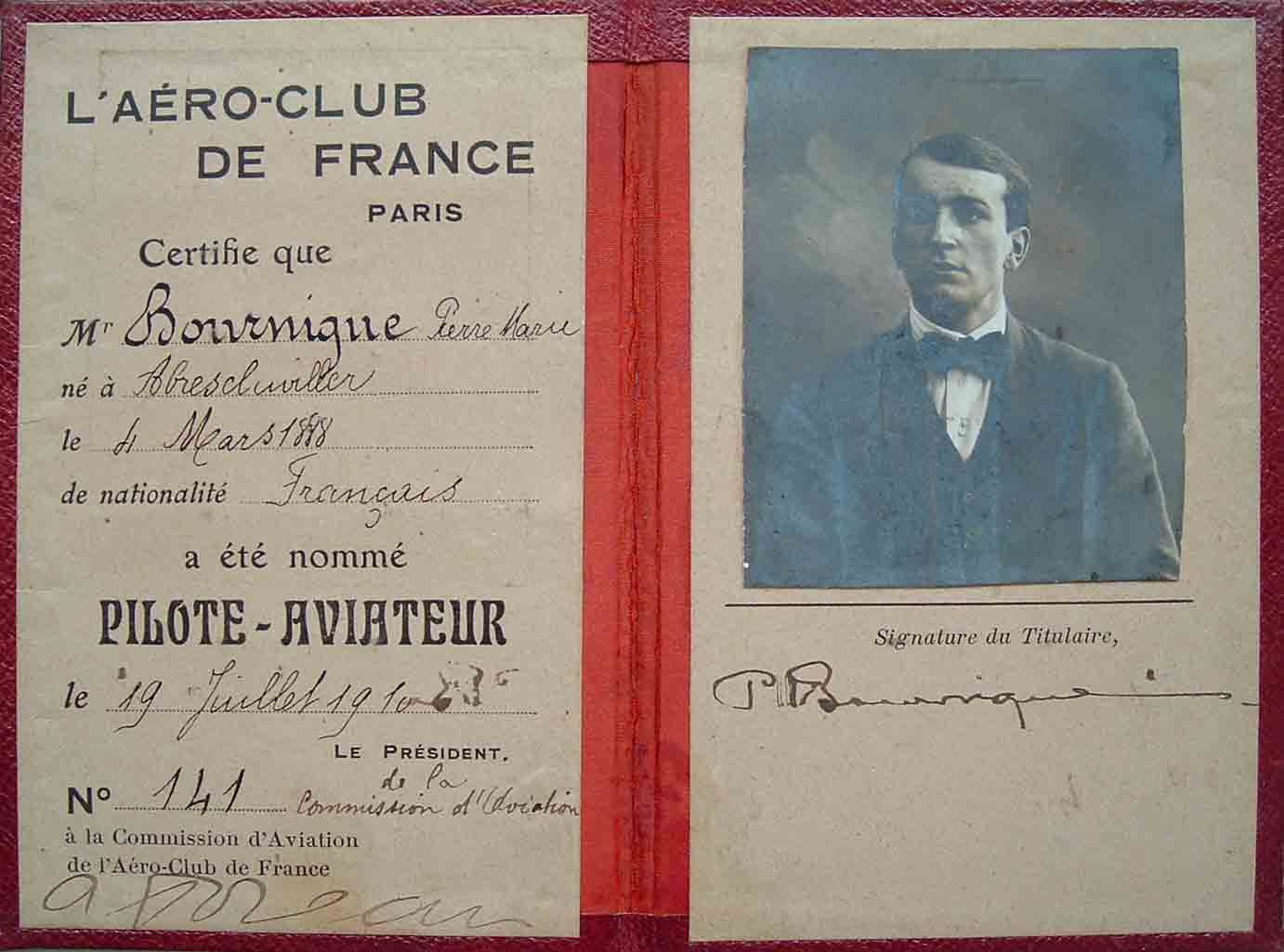 Dans une lettre datée du 9 Juillet 1911, Joseph Bournique explique comment la vocation de pilote vint à un garçon qui semblait décidé à consacrer sa carrière à la forêt après avoir tant étudié et raconte la brêve et héroïque carrière de son fils unique : « A son retour d’Amérique, … Abreschviller était trop calme pour lui qui avait un caractère ardent…Il nous demanda d’aller en Angleterre …Et alors, vint le commencement du malheur… Il assista à une conférence sur l’aviation qui était à son début et le préoccupait comme elle préoccupe aujourd’hui encore, tous les jeunes gens. Il se fit présenter au conférencier et trouva le moyen d’entrer à Paris chez le constructeur d’aéroplane Robert Esnault-Pelterie (marque REP)…Il adorait l’aviation. Inutile de dire que notre pauvre enfant avait trouvé le moyen de forcer peu à peu notre consentement. Il était donc pilote chez REP sous le nom de « Pierre MARIE » . Il mit au point l’appareil des REP et peu à peu, en deux ans, devint un virtuose de l’aviation, comme disaient les journaux…